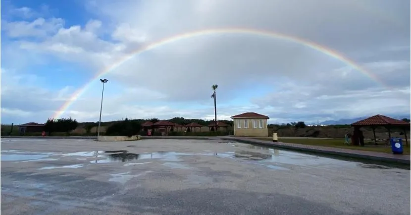 Antalya’nın Serik ilçesinde sabah saatlerinde başlayan yağmur sırasında gökyüzünde oluşan gökkuşağı görsel şölen oluşturdu. Görenlerin hayran kaldığı o anlarda bir turist gökkuşağı kaybolmadan o anları cep telefonu ile kaydetmek için eşinden yardım istedi. İnce ince yağan yağmura aldırış etmeden fotoğraf çekinen ve amacına ulaşan kadın turist ise çektirdiği fotoğraf ile büyük mutluluk yaşadı. /İHA