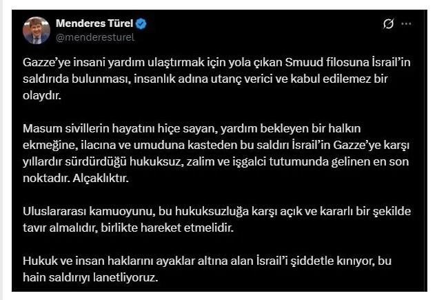 Menderes Türel, X resmi sosyal medyası üzerinden Gazze için yola çıkan Küresel Sumud Filosu'nun durdurulmasına ilişkin uluslararası kamuoyunu birlikte hareket etmeye davet ederek, açıklamasında şu ifadelere yer verdi: