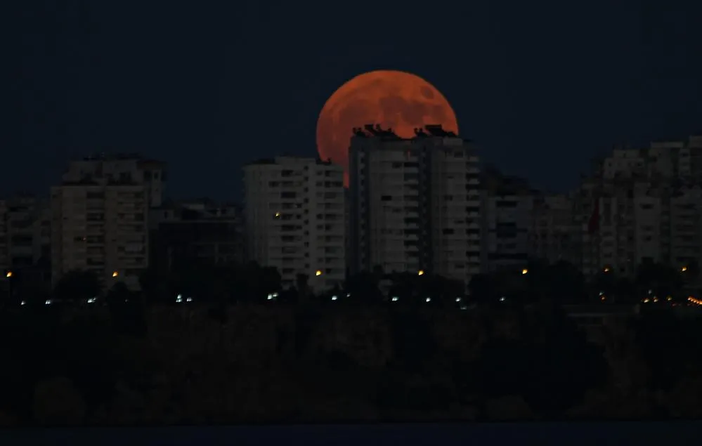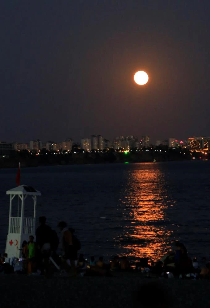 Antalya'da sıcaktan bunalarak Konyaaltı Sahili'ne akın eden vatandaşlar, Süper Ay manzarasını hayranlıkla izledi.