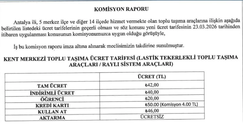 Antalya'da hazırlanan komisyon raporuna göre, 5 merkez ilçe ve diğer 14 ilçede toplu taşıma ücretlerine zam gelecek. Yeni tarifede tam ücret 42 lira, indirimli binişler 40 lira oluyor.