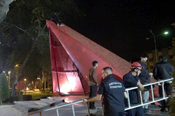 Olay, dün saat 23.00 sıralarında Muratpaşa ilçesi, Bayındır Mahallesi, Palmiye Caddesi'nde meydana geldi. 'Eğlence olsun' diyerek arkadaşları ile birlikte 'Al yazmalım' anıtına çıkan Mehmet Cemal Can Polat, yükseklik korkusu nedeniyle inemeyince mahsur kaldı. Polat’ı indirmek için çaba sarf eden arkadaşları başarılı olamayınca 112 Acil Çağrı Merkezi'nden yardım istendi. İhbar üzerine adrese itfaiye ekipleri, sevk edildi. Gelen ekipler, Polat'ı merdiven uzatarak anıttan inmesini sağladı. Ekiplere teşekkür eden Polat, evine gitti. /GÜN HABER