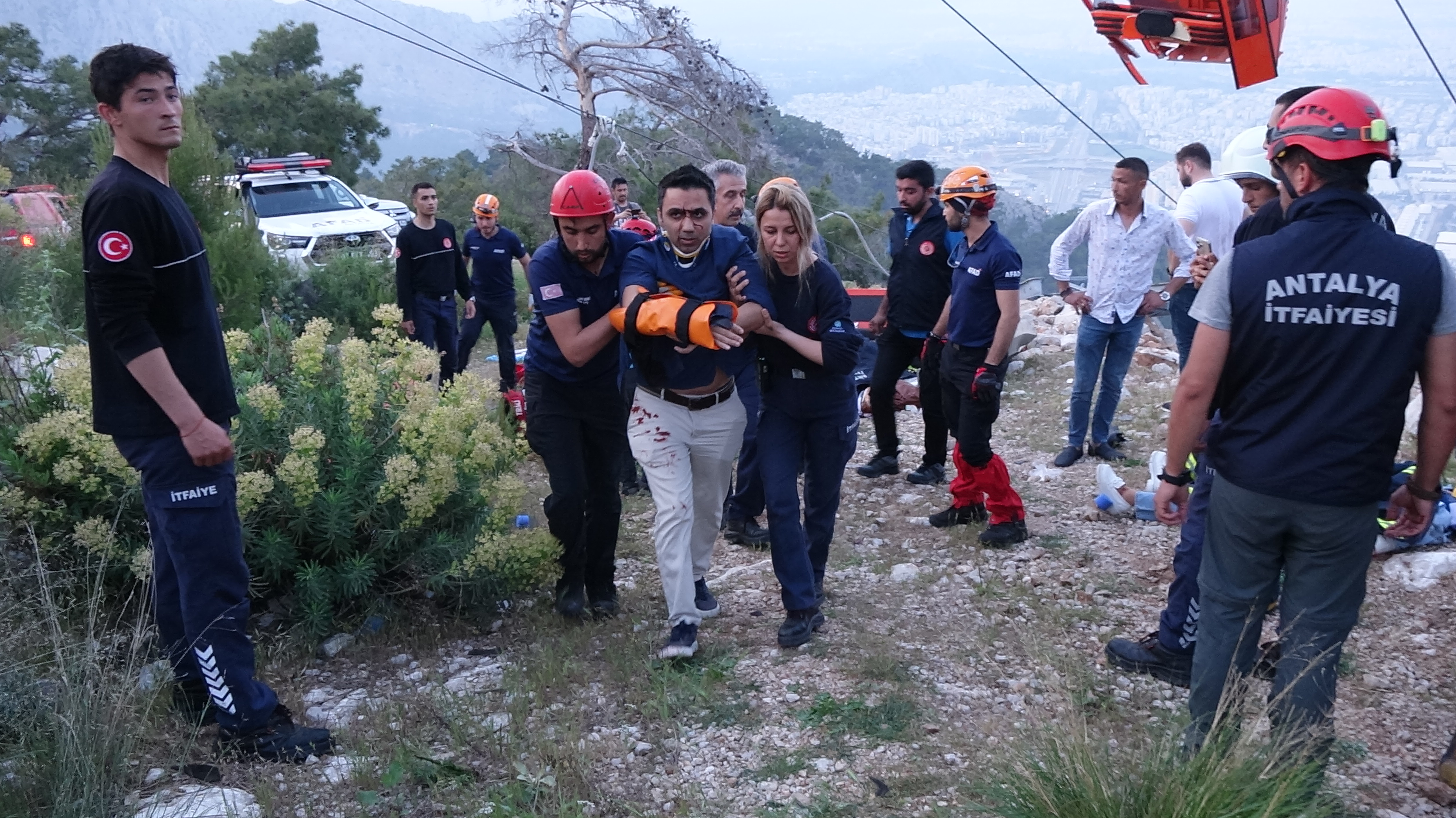 'Antalya’nın Konyaaltı ilçesinde bir teleferik kabininin düşmesi sonucunda bir kişi hayatını kaybetmiş, 10 kişi yaralanmıştır. Kaza sebebiyle 6 Ambulans ve 2 UMKE Timiyle, toplam 24 kişilik sağlık ekibi görevlendirilmiştir. Yaralılar ilk müdahalelerin ardından hastanelere sevk edilerek tedavilerine başlanmıştır, sağlık durumları ciddiyet arz etmemekte. Olay sebebiyle diğer 29 teleferik kabininde mahsur kalan 184 kişiden 30’u uzman ekiplerce kurtarıldı, çalışmalar devam ediyor.