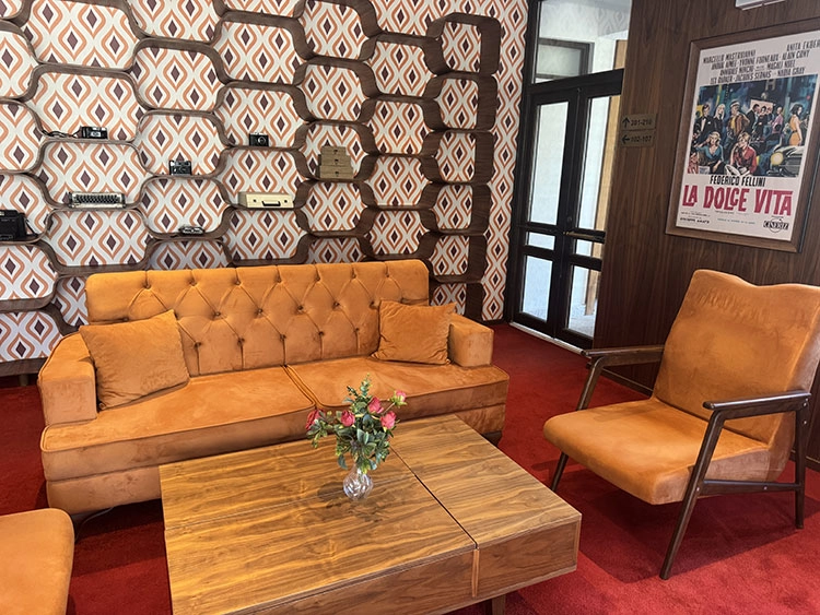 Otelin dışındaki telefon kulübesi, resepsiyondaki çevirmeli telefon, anahtarlar, duvar kağıtları, merdaneli çamaşır makinesi, tuvaletlerde ipli klozet sifonu, lamba açma kapama düğmeleri, eski dikiş ve süpürge makineleri, gramofon, Sümerbank'tan kalma bir piyano, duvara asılmış dönemin film afişlerinin yer aldığı tablolar gibi birçok eşya, misafirlerini 1970'li yıllara götürüyor.