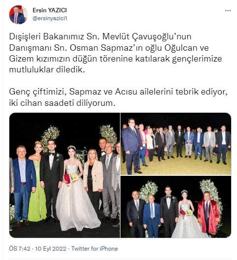 Dışişleri Bakanı Mevlüt Çavuşoğlu’nun Antalyalı danışmanı Osman Sapmaz, dillere destan bir düğünle oğlunu evlendirdi. Bir kuş sütünün eksik olduğu 5 yıldızlı düğünün menüsü dikkat çekti.