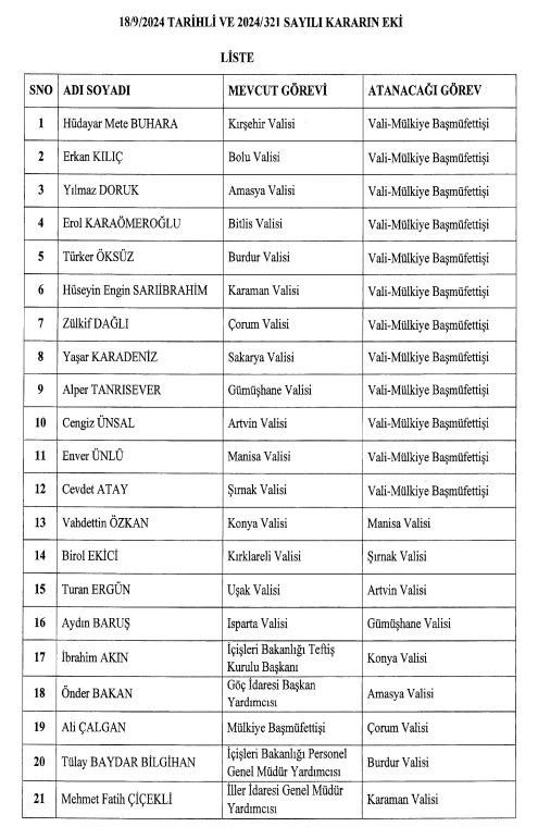 Konya Valisi Vahdettin Özkan; Manisa Valiliğine, Kırıkareli Valisi Birol Ekinci, Şırnak Valiliğine, Uşak Valisi Turan Ergün, Artvin Valiliğine, Isparta Valisi Aydın Baruş, Gümüşhane Valiliğine, İçişleri Bakanlığı Teftiş Kurulu Başkanı İbrahim Akın, Konya Valiliğine, Göç İdaresi Başkan Yardımcısı Önder Bakan, Amasya Valiliğine, Mülkiye Başmüfettişi Ali Çalgan, Çorum Valiliğine, İçişleri Bakanlığı Personel Genel Müdür Yardımcısı Tülay Baydar Bilgihan, Burdur Valiliğine, İller İdaresi Genel Müdür Yardımcısı Mehmet Fatih Çiçekli, Karaman Valiliğine, Vali- Mülkiye Başmüfettişi Abdullah Erin, Isparta Valiliğine, Vali- Mülkiye Başmüfettişi Rahmi Doğan, Sakarya Valiliğine, Bursa- Gemlik Kaymakamı Uğur Turan, Kırklareli Valiliğine, İstanbul- Sancaktepe Kaymakamı Ahmet Karakaya, Bitlis Valiliğine, Hatay- İskenderun Kaymakamı Mustafa Sefa Demiryürek, Kırşehir Valiliğine, İstanbul- Ümraniye Kaymakamı Abdulaziz Aydın, Bolu Valiliğine, Ankara- Etimesgut Kaymakamı Naci Aktaş, Uşak Valiliğine atandı.
