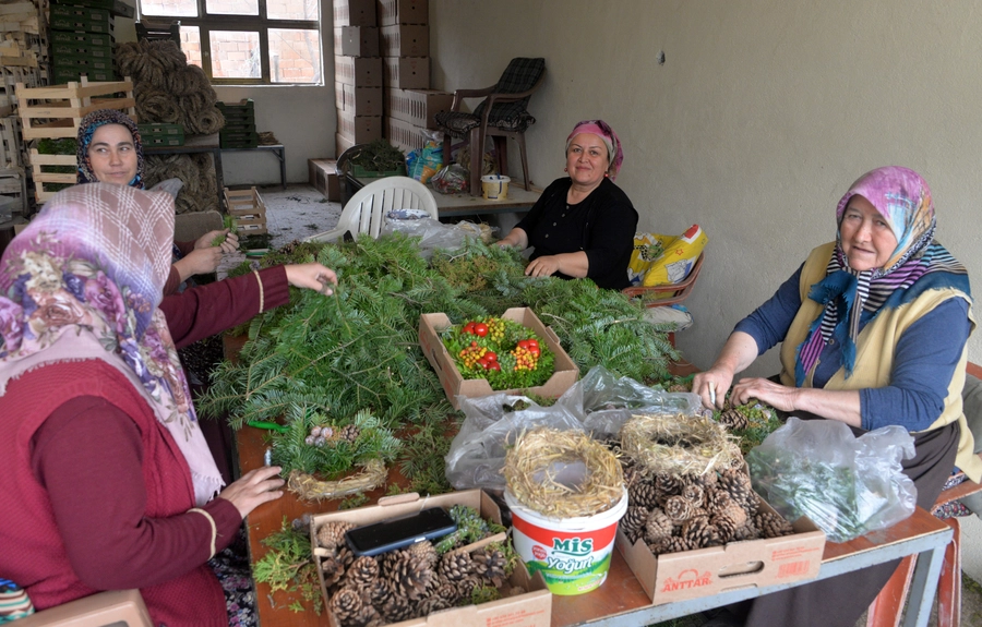 Bölgede çelenk üretimi ve ihracatı yapan bir firmanın sorumlusu Ulaş Aktürk, "Çelenk işini 2005 yılından beri yapıyoruz. Evlerin önüne sabah meyveler ve bitkiler dağıtılıyor. Akşamüzeri, öğleden sonra 14.00- 15.00 gibi yapılan çelenkler toplanıyor. Depoya getiriliyor. Depoda paketleniyor. Firma olarak bizim 100'e yakın ev var. Kadınlar bitki ve meyveleri sarıyor, öğleden sonra topluyoruz. Yaklaşık 2 günde bir TIR'la Hollanda ve Almanya'ya gönderiyoruz. Köydeki neredeyse hemen her evde 25 Ağustos'ta başlayıp aralık ayının ilk haftasının sonuna kadar kadınlar ve bazı erkekler bu işi yapıyor" dedi.