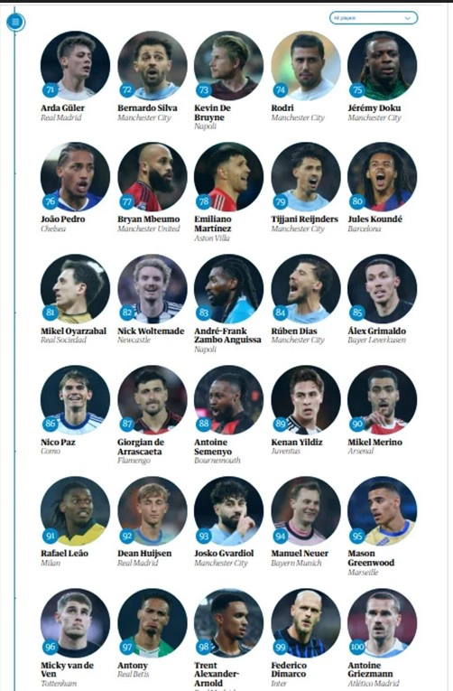 İngiltere'nin köklü medya kuruluşlarından The Guardian, her sezon açıkladığı gibi bu sezon da 'Dünyanın en iyi 100 futbolcusu' listesini duyurmaya hazırlanıyor.