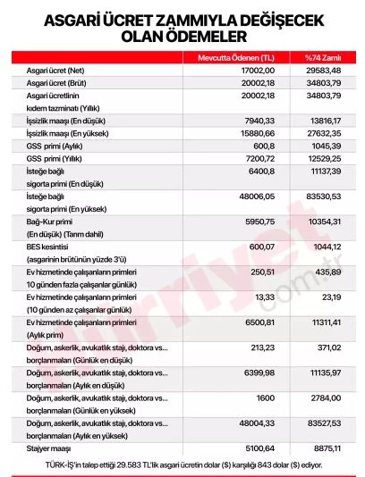 TÜRK-İŞ'in talebi Asgari Ücret Tespit Komisyonu'ndan aynen geçerse brüt asgari ücret 34 bin 803 liraya yükselecek. 10 yıldır çalışan bir asgari ücretlinin kıdem tazminatı 348 bin 30 liraya ulaşacak.