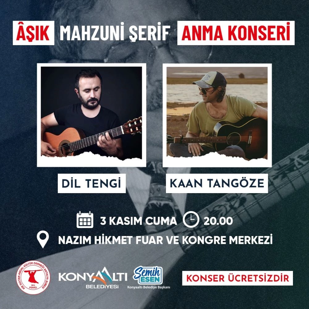 'Mevlam Gül Diyerek', 'Çeşmi Siyahım', “Yuh Yuh”, “Dom Dom Kurşunu” ve “Mehmet Emmi” gibi türküleriyle gönüllerde taht kuran halk ozanı Aşık Mahzuni Şerif, Konyaaltı’nda anılıyor. Konyaaltı Belediyesi ve Pir Sultan Abdal Kültür Derneği Antalya Şubesi’nin ortaklaşa gerçekleştireceği etkinlikte Duman grubunun solisti, sevilen sanatçı Kaan Tangöze ve Dil Tengi Grubu Aşık Mahzuni Şerif’in türkülerini seslendirecek. Nazım Hikmet Kongre ve Fuar Merkezi’nde 3 Kasım Cuma günü saat 20.00’de gerçekleştirilecek konser ücretsiz olacak.