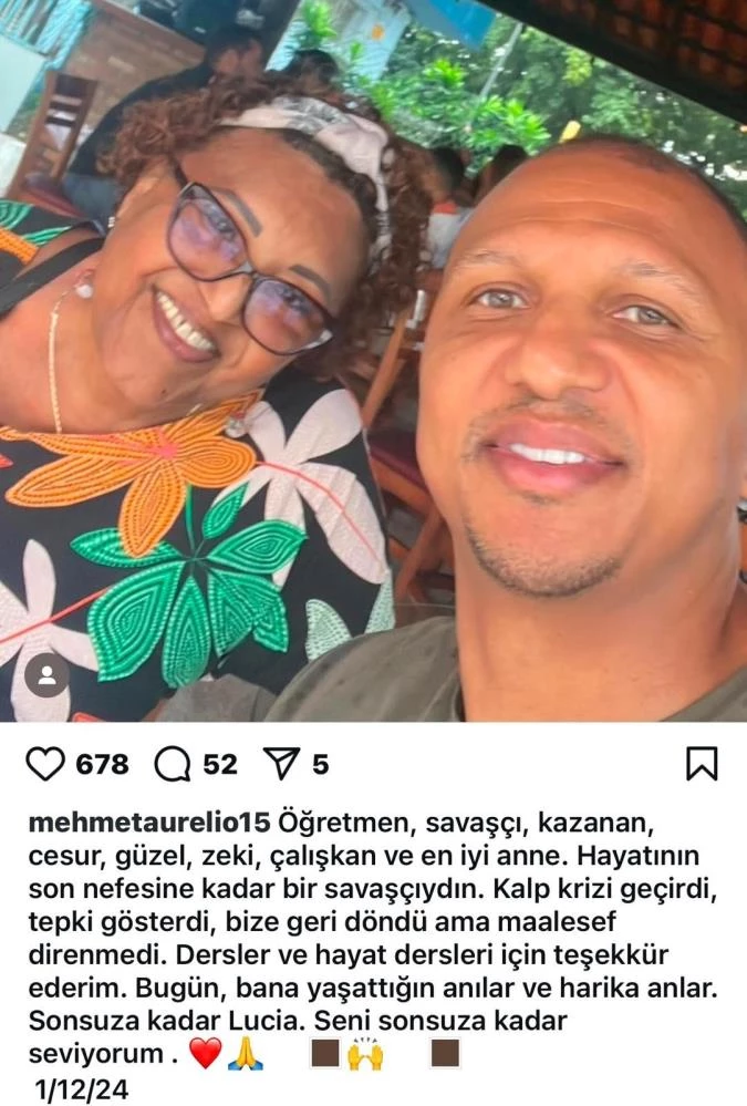 Eski Milli Futbolcu ve Antalyaspor yardımcı antrenörü Mehmet Aurelio’nun annesi Lucia Brito Dos Prazares dün İstanbul Çekmeköy’de bulunan evinde kalp krizi geçirerek hayatını kaybetti. Anne Lucia Brito Dos Prazares‘in cenazesi otopsi yapılmak üzere İstanbul Adli Tıp Kurumu morguna gönderildi. Annesinin cenazesini almak için gelen Mehmet Aurelio soruları cevapsız bırakırken sosyal medya hesabından annesi için duygusal mesaj paylaştığı görüldü.