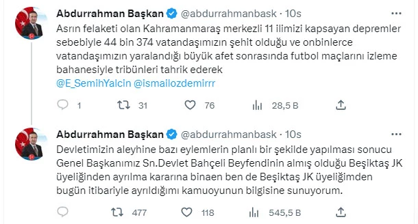 “Asrın felaketi olan Kahramanmaraş merkezli 11 ilimizi kapsayan depremler sebebiyle 44 bin 374 vatandaşımızın şehit olduğu ve onbinlerce vatandaşımızın yaralandığı büyük afet sonrasında futbol maçlarını izleme bahanesiyle tribünleri tahrik ederek Devletimizin aleyhine bazı eylemlerin planlı bir şekilde yapılması sonucu Genel Başkanımız Sn.Devlet Bahçeli Beyfendinin almış olduğu Beşiktaş JK üyeliğinden ayrılma kararına binaen ben de Beşiktaş JK üyeliğimden bugün itibariyle ayrıldığımı kamuoyunun bilgisine sunuyorum.”