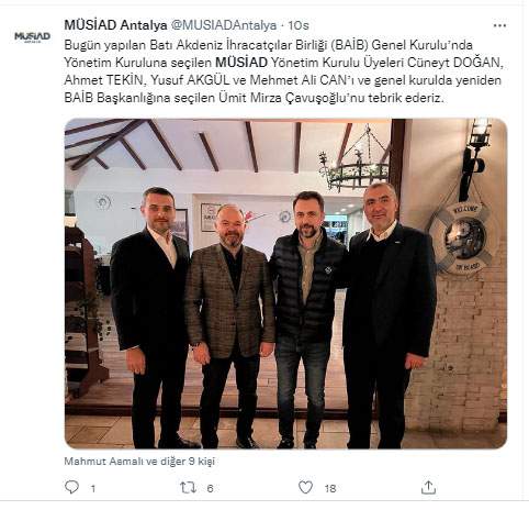 “Bugün yapılan Batı Akdeniz İhracatçılar Birliği (BAİB) Genel Kurulu’nda Yönetim Kuruluna seçilen MÜSİAD Yönetim Kurulu Üyeleri Cüneyt DOĞAN, Ahmet TEKİN, Yusuf AKGÜL ve Mehmet Ali CAN’ı ve genel kurulda yeniden BAİB Başkanlığına seçilen Ümit Mirza Çavuşoğlu’nu tebrik ederiz.” /SON DAKİKAHABER