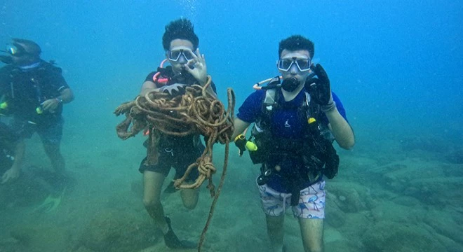Antalya'nın Finike ilçesinde Batık Ada bölgesinde dalgıçlar tarafından sualtı temizliği yapıldı.