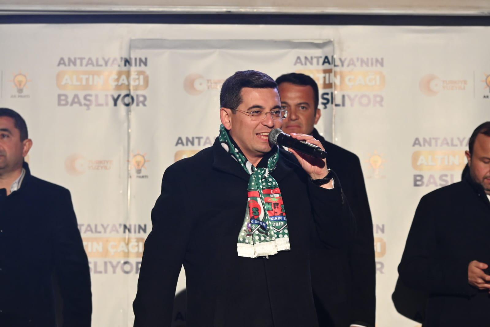 Kınık Seçim Koordinasyon Merkezi’nin açılışında konuşan Cumhur İttifakı’nın Antalya Büyükşehir Belediye Başkan adayı Hakan Tütüncü, “Bize verdiğiniz her oyu helal ettirmek için 1 Nisan 2024 itibariyle Antalya’ya hizmet için işe koyulacağız. Kazanan Antalya’mız ve 19 ilçemiz olacak. “dedi.