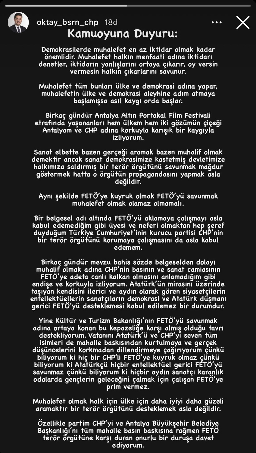 Antalya Altın Portakal Film Festivali’ndeki tartışmaya sosyal medya hesabından dahil olan Kepez Belediyesi ve Büyükşehir CHP Meclis Üyesi Oktay Başaran’ın, Ak Parti’ye geçeceği iddia edildi.
