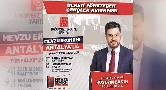 Program ile ilgili bilgiler veren, BTP Antalya İl Başkanı Sinan Avşar;' Bağımsız Türkiye Partisi'nin Mevzu Ekonomi: Çözüm Milli Ekonomi Modeli programları Ekim ayı içerisinde Gaziantep, Malatya,Ordu'dan sonra 23 Ekimde Antalya'da yapılacak.