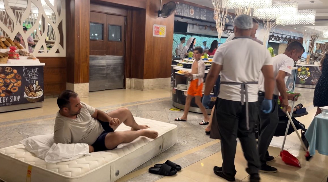Antalya'nın Serik ilçesinde 5 yıldızlı otelde konaklayan Cenk Bilge, arızalanan klimasına çözüm bulunmadığı gerekçesiyle otelin yemekhanesine götürdüğü yatağa uzanıp yattı. Bilge'nin bu görüntüleri, sosyal medyada paylaşmasından 1 saat sonra sorun çözüldü.