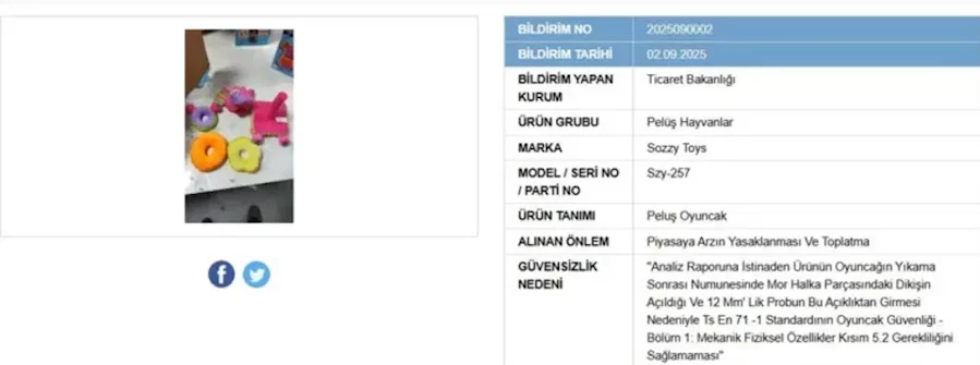Ticaret Bakanlığı tarafından yürütülen denetim çalışmaları kapsamında, "Sozzy Toys" markasına ait peluş oyuncakta usulsüzlük tespit edildi. Halk sağlığını tehdit eden ürünün piyasadan toplatması yönünde karar alındı.