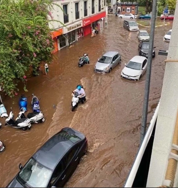 Dizimin üstüne kadar suyun içindeyim. Yaklaşık 1 saat sürdü sağanak yağış. 1 saat içerisinde manzara bu. Dükkanların içi de su ile dolmuş durumda.