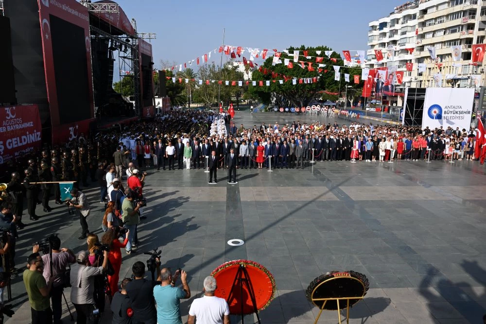 30 Ağustos Zafer Bayramı'nın 101. yıl dönümü kapsamında Antalya’da ilk olarak Cumhuriyet Meydanı’nda tören düzenlendi. Antalya Valisi Hulusi Şahin ve Antalya Büyükşehir Belediye Başkanı Muhittin Böcek, meydandaki Atatürk Anıtı’na çelenk bıraktı.
