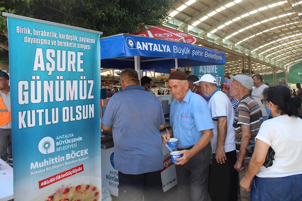 Antalya Büyükşehir Belediyesi Sosyal Hizmetler Daire Başkanlığı birlik, beraberlik, kardeşlik, paylaşma, dayanışma ve bereketin simgesi aşure ikramlarına devam ediyor. Muharrem Ayı boyunca 40 bin kişiye aşure dağıtacak olan Büyükşehir Belediyesi ekipleri Finike, Kaş, Gazipaşa ve Kemerli vatandaşlara ikramda bulundu.
