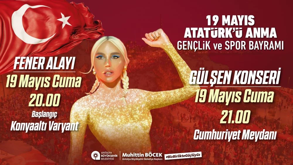 Fener alayının ardından Cumhuriyet Meydanı'nda konser düzenlenecek. 19 Mayıs kutlamaları Cumhuriyet Meydanı’nda pop müziğinin sevilen ismi ünlü sanatçı Gülşen saat 21.00’da en güzel şarkılarını Antalyalılar için seslendirecek. Gülşen konserine tüm Antalyalılar davetli.