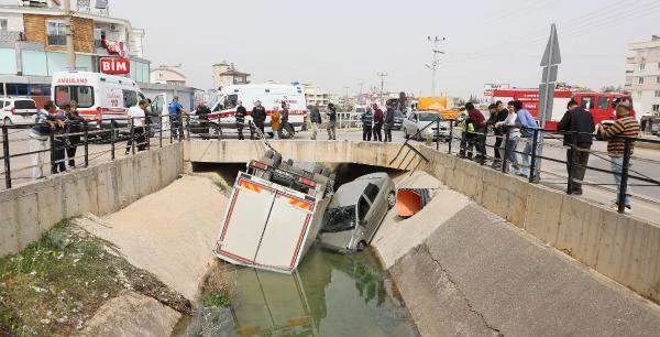 Antalya'da iki aracın karıştığı kazada kontrolden çıkıp ters dönen kamyonet ile otomobil su kanalına uçtu. Kazada otomobil sürücüsü Sümeyra Aydın'ın burunu bile kanamazken hafif yaralanan kamyonet sürüsü Mustafa Demir ambulansla hastaneye götürüldü.