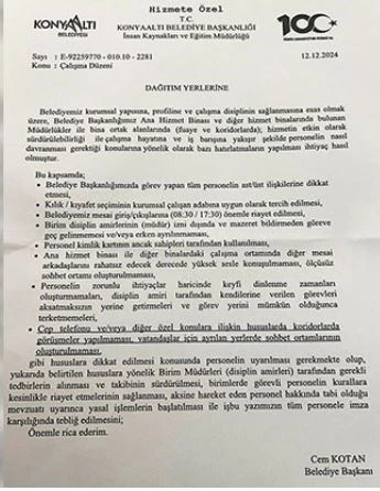 CHP’li Konyaaltı Belediye Başkanı Cem Kotan, belediye personelinin çalışma disiplinine ilişkin bir dizi hatırlatmayı içeren yeni bir genelge yayınladı. Personeller, maaşlarının ödenmesi yerine üzerlerine ekstra baskı konulmasının kabul edilemez olduğunu ifade ediyor.