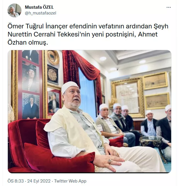 Özel sosyal medya hesabından yaptığı paylaşımda tarikatın yeni postnişinin 17 yaşından beri Cerrahi Tarikatı'na mensup olan Türk Sanat Müziği sanatçısı Ahmet Özhan olduğunu aktardı.