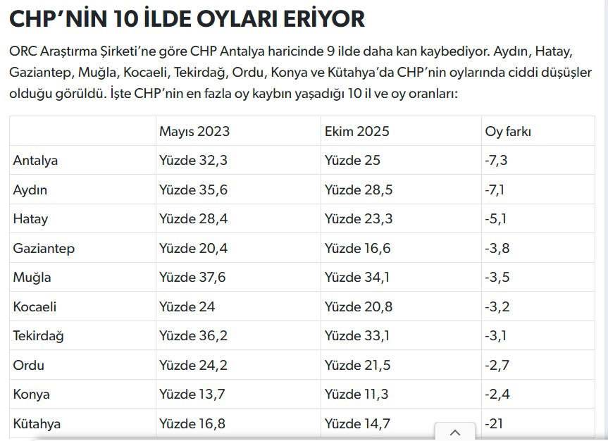 Sosyal ile politik konulara yönelik kamuoyu araştırması yapan ve elindeki verileri baz alarak bir anket çalışması düzenleyen ORC Araştırma Şirketi, CHP’nin 10 ildeki oy oranları üzerine bir araştırma yayınladı. Araştırmada aralarında Antalya’nın da olduğu 10 ilde CHP’nin oy oranlarında ciddi düşüşler olduğu gözlemlendi.