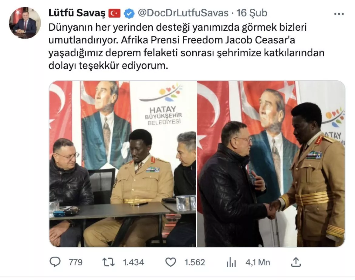 Hatay Büyükşehir Belediye Başkanı Lütfü Savaş sosyal medya hesabından bir fotoğraf paylaşmış ve Afrika Prensi Freedom Jacob Ceasar'ı ağırladıklarını belirtmişti. Gerçek sonradan ortaya çıktı.