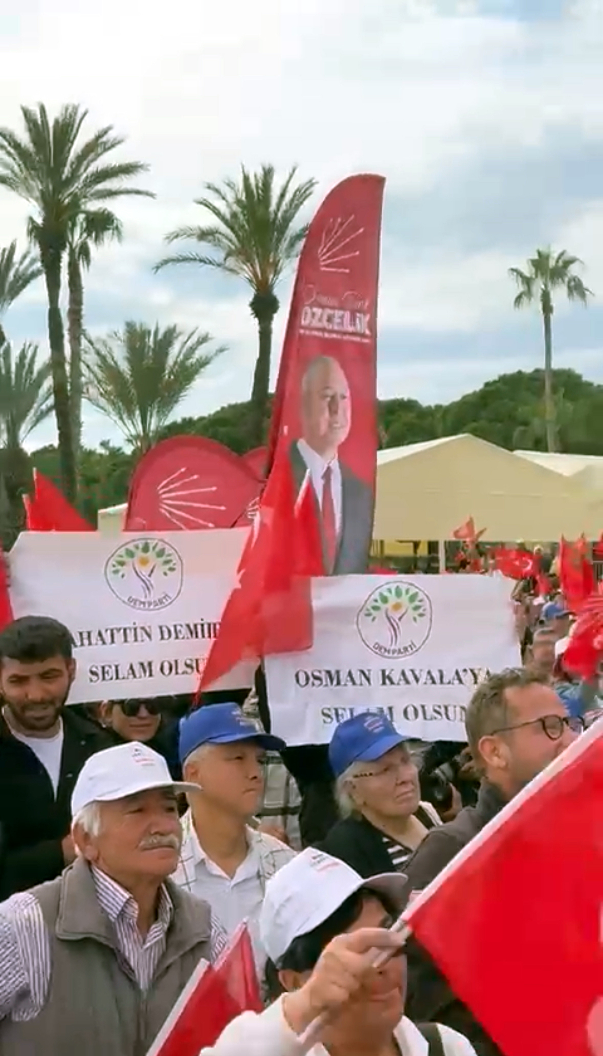 CHP Genel Başkanı Özgür Özel’in katılımıyla Alanya’da gerçekleştirilen mitingde kimliği belirsiz kişilerce, üzerinde DEM Parti logosu bulunan, ‘Selahattin Demirtaş’a selam olsun’ ve ‘Osman Kavala’ya selam olsun’ yazılı iki pankart açıldı.