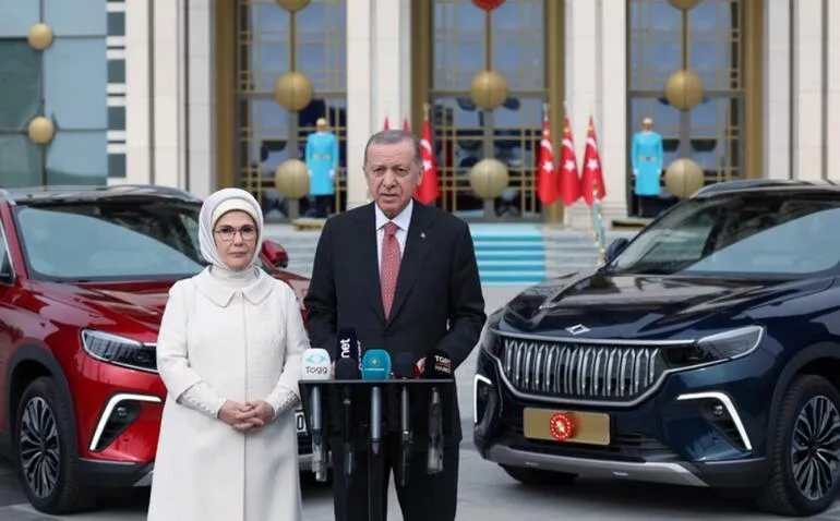 Türkiye'nin yerli ve milli otomobili Togg'un ilk siparişini veren Cumhurbaşkanı Recep Tayyip Erdoğan ve Emine Erdoğan'a araç teslim edildi. Cumhurbaşkanı Erdoğan ' Togg tüm testleri alnının akıyla vermiş özel bir otomobildir. İnşallah bugünden itibaren Togg'u yollarda görmeye başlıyoruz' dedi. Cumhurbaşkanı Erdoğan 'Kamu bankalarının bu noktada kredi yastıkları müsaittir. Hele araçlara rahatlıkla yapabilirler. Konutlarda bunu nasıl yapıyorsak otomobilde de bunu yapmak mümkündür' açıklamasını yaptı.