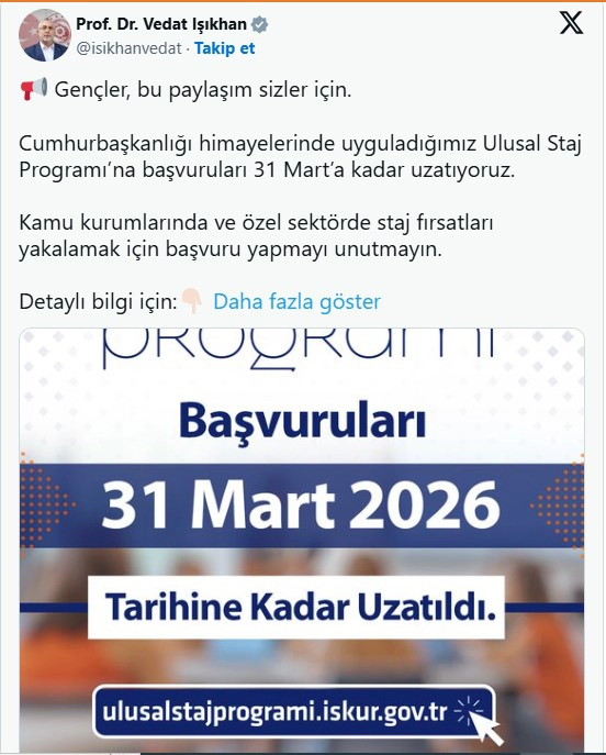 Çalışma ve Sosyal Güvenlik Bakanı Vedat Işıkhan, "Cumhurbaşkanlığı himayelerinde uyguladığımız Ulusal Staj Programı'na başvuruları 31 Mart'a kadar uzatıyoruz" dedi.