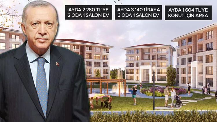 Cumhuriyet tarihinin en büyük sosyal konut projesini açıklayan Cumhurbaşkanı Recep Tayyip Erdoğan, dar gelirli vatandaş için, 5 yılda 500 bin konut, 250 bin altyapılı arsa ve 50 bin işyerinin satışa sunulacağını söyledi. Konutta fiyatlar 608 bin TL, taksitler 2 bin 280 TL’den başlayacak. Dar gelirli vatandaş 112 bin 500 TL’den başlayan fiyatla arsa, 350 bin TL’den başlayan fiyatla işyeri sahibi olacak. Başvurular bugün başlarken, yılbaşında da ilk temel atılacak.