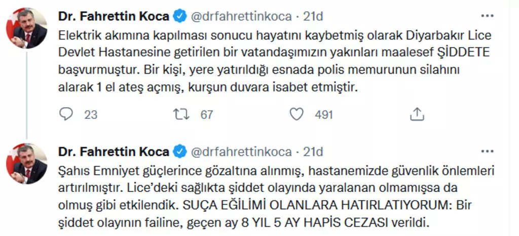 Sağlık Bakanı Fahrettin Koca ise yaşanan olayın ardından gece saatlerinde sosyal medya hesabından açıklama yaptı. Bakan Koca paylaşımında şu ifadeleri kullandı: 'Elektrik akımına kapılması sonucu hayatını kaybetmiş olarak Diyarbakır Lice Devlet Hastanesine getirilen bir vatandaşımızın yakınları maalesef şiddete başvurmuştur. Bir kişi, yere yatırıldığı esnada polis memurunun silahını alarak 1 el ateş açmış, kurşun duvara isabet etmiştir. Şahıs Emniyet güçlerince gözaltına alınmış, hastanemizde güvenlik önlemleri artırılmıştır. Lice’deki sağlıkta şiddet olayında yaralanan olmamışsa da olmuş gibi etkilendik. Suça eğilimi olanlara hatırlatıyorum: Bir şiddet olayının failine, geçen ay 8 yıl 5 ay hapis cezası verildi.' /MYNET.COM