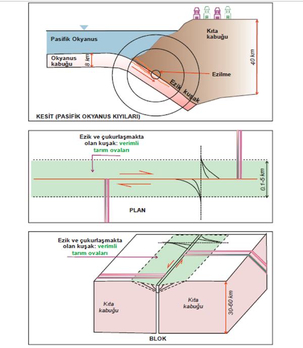 “Ülkemizde, yer kabuğunun yer değiştirme hareketinin olacağı çizgisellikler oldukça belirgindir. Başka bir anlatımla, söz konusu ülkelerde okyanus kabuğu kıta kabuğunun altına daldığında kırılma ve ezilmeler 10-30 kilometre derinlikte olmaktadır. Oysa Türkiye'de, geniş ezik kuşaklar yüzeyde oluşmaktadır. Ülkemizdeki depremler ana fay kuşakları içerisinde yinelenmektedir. Fay kuşakları boyunca oluşan toprak zeminler üzerinde birinci sınıf tarım ovaları oluşmuş ve oluşmayı sürdürmektedir. Depremler sırasında yer altında yayılan sismik dalgalar yer yüzeyine ulaştıklarında titreşimler üretir. Yer yüzeyindeki herhangi bir yerde etkiyen bu titreşimlerin süresi ve büyüklüğü, depremin büyüklüğüne, kaynağına olan uzaklığa ve yerel zemin koşullarına bağlıdır. Burada hayati önem taşıyan konu, deprem dalgalarının kaya ve toprak zeminlerdeki yayılımıdır. Toprak zeminlerde sismik dalga hızının çok yavaş (dalga boyunun uzun) olması nedeniyle çok katlı binalar yıkılmaya eğilimlidir.'
