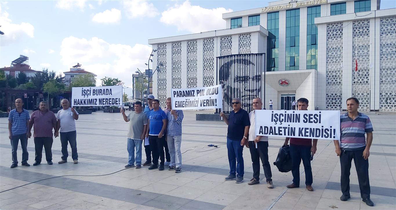 Döşemealtı Belediyesi’nde çalıştıktan sonra emekliliği hakeden bir grup çalışan, emekliye ayrıldıktan sonra kıdem tazminatlarını alamadıkları gerekçesiyle pankartlı eylem yaptı. Dördü kadrolu 13’ü belediye bağlı şirketten emekli 17 işçi belediye yönetiminden alacakları ikramiyeyi istiyor. Belediyenin bulunduğu Kent Meydanı’na ellerinde “Paramız pul oldu emeğimizi verin”, “İşçinin sesi adaletin kendisi”, “İşçi burada hakkımız nerede?” yazılı pankartlarla gelen 13 işçi, emekli ikramiyelerinin ödenmesini istiyor.