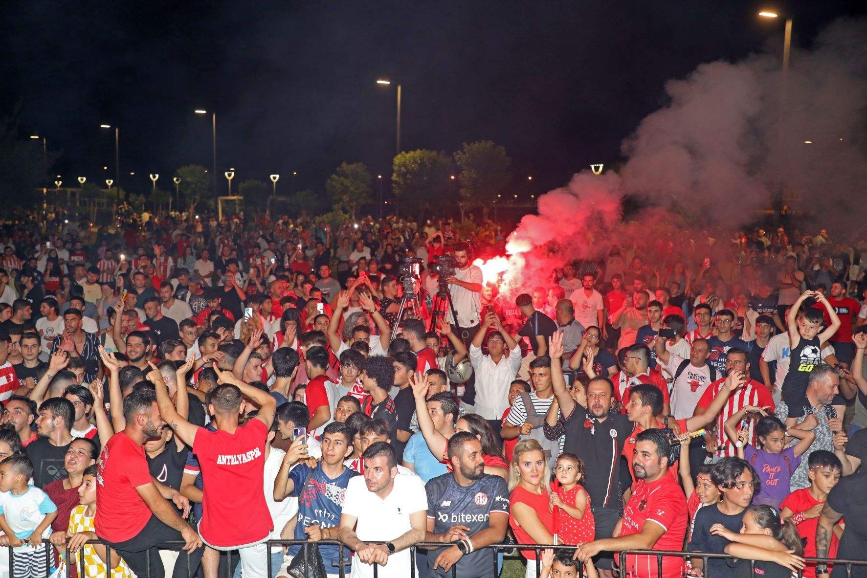 Saatler 22.00’ı gösterdiğinde ise taraftarlar Boğaçayı Köprüsü etrafında meşaleleri yakarak görsel şölen oluşturdu. Kırmızı-Beyazlılar havai fişek gösterisi ile geceyi aydınlattı. Antalyasporlu taraftarlar bu sırada tezahüratlarda bulunarak kulübe olan sevgilerini dile getirdi.