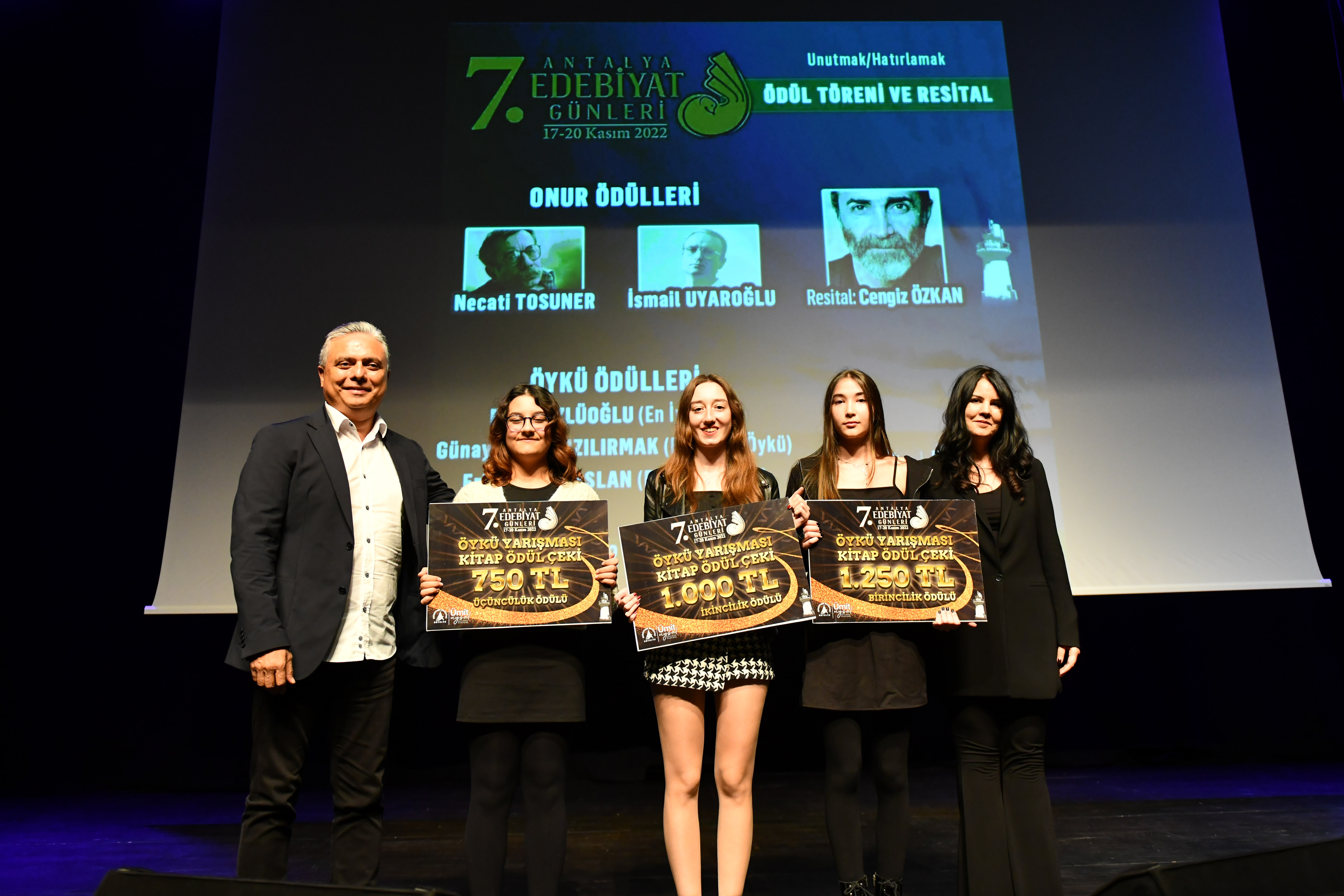 Antalya Edebiyat Günleri’nin ödül gecesi, senarist, yönetmen, oyun ve köşe yazarı Işıl Özgentürk’ün ekim ayında düzenlediği öykü atölyesinden çıkan ‘genç hikayelere’ ödüllerin verilmesiyle başladı. ‘Hikaye’ isimli çalışmasıyla Yenersu Duru Koç’un üçüncülük ödülünü aldığı gecede ikincilik ödülü ‘Hayaller Okyanusu’yla Melike Aybey’in oldu. Birincilik ödülü ise ‘Dedemin Bakkalı’ isimli öyküsüyle Zeynep Çelikkanat’a verildi. Ödülleri, Dr. Ayşegül Tözeren takdim ederken dereceye girenler, toplam 3 bin liralık kitap çekinin de sahibi oldu.
