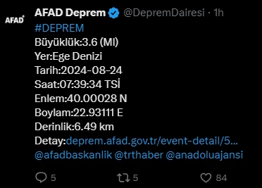 AFAD tarafından yapılan açıklamaya göre, deprem saat 07:39'da gerçekleşti ve büyüklüğü 3.6 olarak ölçüldü. Depremin merkez üssünün Ege Denizi olduğu ve derinliğinin 6.49 km olduğu belirtildi.