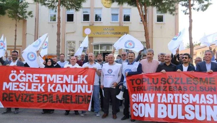 Eğitim Bir Sen Antalya Şubesi’ne üye sendikalılar Antalya İl Milli Eğitim Müdürlüğü önünde toplanarak öğretmenlerin beklentilerini karşılamadığı gerekçesiyle Öğretmenlik Meslek Kanununda değişiklik yapılmasını talep etti.