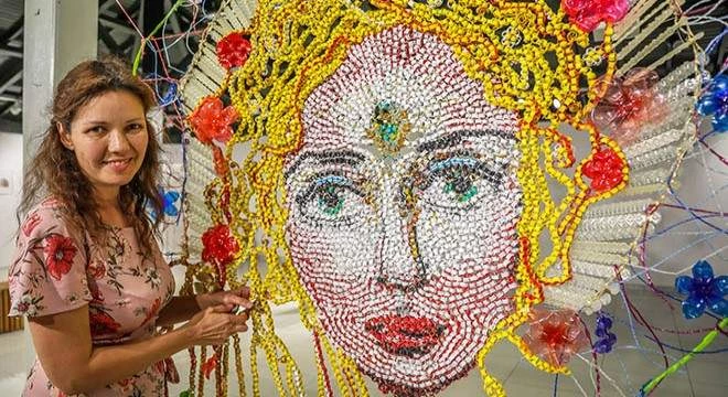 Rusya'dan 3 yıl önce geldiği Antalya'da yaşamını sürdüren geri dönüşüm sanatçısı Güzel Amirova, plastik poşetten heykel yapan ilk sanatçı olduğunu söyledi. Dünyanın farklı şehirlerinde düzenlenen ekofestivallerde heykellerinin sergilendiğini anlatan Amirova, son olarak ekmek poşetlerinin ağzını kapatmak için kullanılan metal klipslerden kadın figürü yaptı. Kadının yüzünü ve saçlarını klipsleri iç içe geçirerek ortaya çıkardığını anlatan Amirova, saçlardaki çiçeklerin plastik şişe altlarından ortaya çıkartıldığını söyledi.