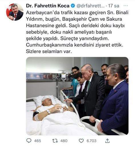 “Azerbaycan’da trafik kazası geçiren Sn. Binali Yıldırım, bugün, Başakşehir Çam ve Sakura Hastanesine geldi. Saçlı derideki doku kaybı sebebiyle, doku nakli ameliyatı başarılı şekilde yapıldı. Süreçte yanındaydım. Cumhurbaşkanımızla kendisini ziyaret ettik. Sizlere selamları var.”