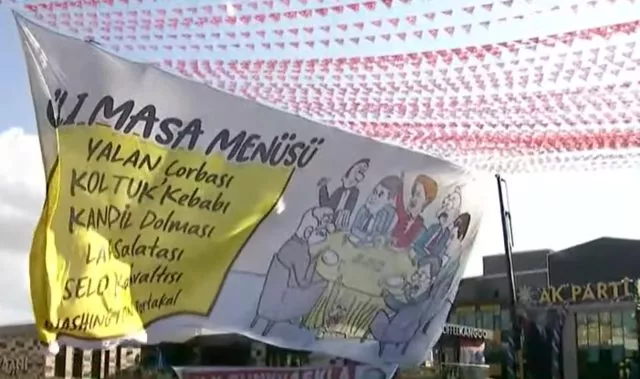 Şimdi burada bir pankart var. 6'lı masa menüsü diyorlar. Herhalde siz bu menüyü görmüşsünüzdür, ne var bu menüde, yalan çorbası var, koltuk kebabı var, kandil dolması var, laf salatası var, Selo kahvaltısı var, Washington portakalı var. Ye yiyebildiğin kadar.
