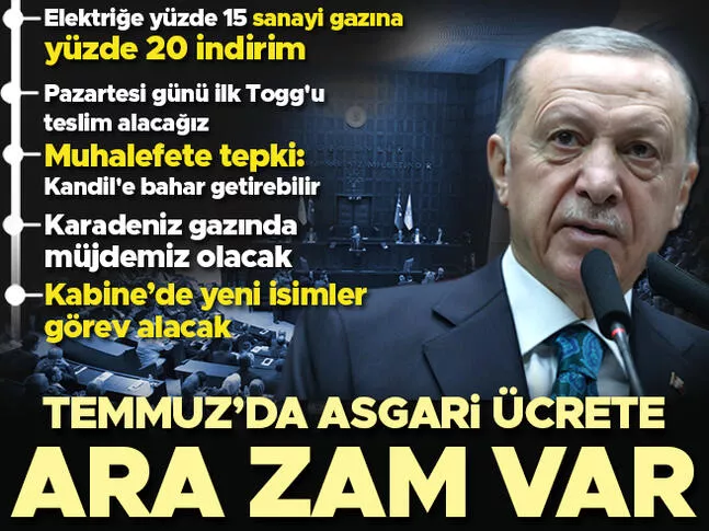 Cumhurbaşkanı ve AK Parti Genel Başkanı Recep Tayyip Erdoğan, partisinin grup toplantısında konuştu. TOGG ön siparişinin 177 bini geçtiğini duyuran Erdoğan, 'Bu tablo milletimizin lisansı, tasarımı ve üretimiyle gerçek anlamda ilk yerli otomobile samimiyetle sahip çıktığını gösteriyor. Pazartesi günü ilk TOGG'u teslim alacağız.' ifadelerini kullandı. Erdoğan, elektrikte tüm abonelere yüzde 15, sanayide ise doğal gazda yüzde 20 indirime gidileceğini duyurdu. 14 Mayıs seçimlerinden sonra Kabine'de değişim olacağını söyleyen Erdoğan, 'Bakanlarımız bugüne kadar Kabine'de verdikleri hizmetleri 14 Mayıs'tan sonra Meclis'te sürdüreceklerdir. Kabine'de yeni isimlere görev vereceğiz. dedi. Grup konuşmasının bitiminde gazetecilerin sorularını yanıtlayan Erdoğan, asgari ücrete Temmuz'da ara zam geleceğini açıkladı.