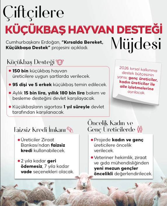 "2026 yılında 14,5 milyar lira olan kırsal kalkınma destek bütçemizin yarısını genç ve kadın üreticiler ile aile işletmelerimize ayırıyoruz. Ayrıca küçükbaş hayvancılığı desteklemek amacıyla yeni bir projeyi daha devreye sokuyoruz. 'Kırsalda bereket, küçükbaşa destek' adını verdiğimiz projenin ilk etabında tam 150 bin küçükbaşı üreticilerimize uygun şartlarda vereceğiz. Projeden faydalanacak her üreticimize 95 dişi ve 5 erkek küçükbaş temin edeceğiz. Bu hayvanlar için aylık 15 bin lira, yıllık 180 bin lira bakım ve besleme desteğini biz karşılayacağız. Projenin finansmanı için üreticilerimiz Ziraat Bankasından faizsiz kredi kullanabilecek. Bu kredilerde 2 yıla kadar geri ödemesiz, devamında da 7 yıla kadar vade seçenekleri var. Projeden faydalanan üreticilerimizin alacakları küçükbaşların sigortasını 1 yıl biz karşılayacağız."