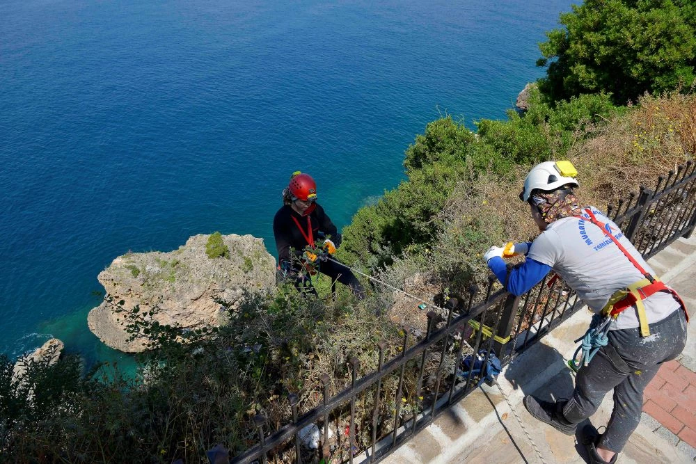 Antalya’da Muratpaşa Belediyesi ve (AÜ) Mağara Araştırmaları Topluluğu öğrencileri, denizden yüksekliği yer yer 40 metreyi bulan falezlerde temizlik yaptı. Antalya’nın doğa harikası kıyı bandında ekipler kilolarca cam ve plastik atık topladı.