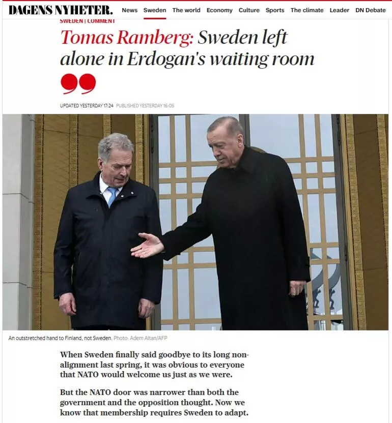 Dagens Nyheter gazetesi üyelik sürecine ilişkin bir analizinde 'İsveç, Erdoğan'ın bekleme odasında yalnız kaldı' ifadelerini kullandı.