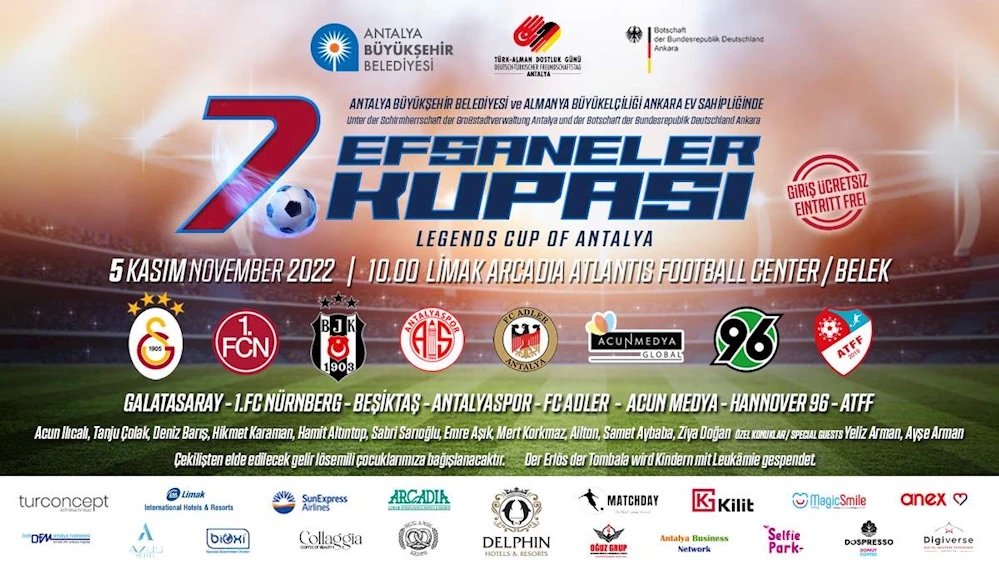 - Efsaneler Kupası, Türk-Alman Dostluk Günü etkinlikleri kapsamında Antalya Büyükşehir Belediyesi ve Almanya Federal Cumhuriyeti Ankara Büyükelçiliği ev sahipliğinde 5 Kasım Cumartesi günü gerçekleştirilecek. ‘Efsaneler Kupası’nda Türk ve Alman futbolunun efsane isimleri yeşil sahada buluşacak. Antalya’da futbol şöleni yaşatacak turnuva Limak Arcadia Atlantis Football Center’de yapılacak.